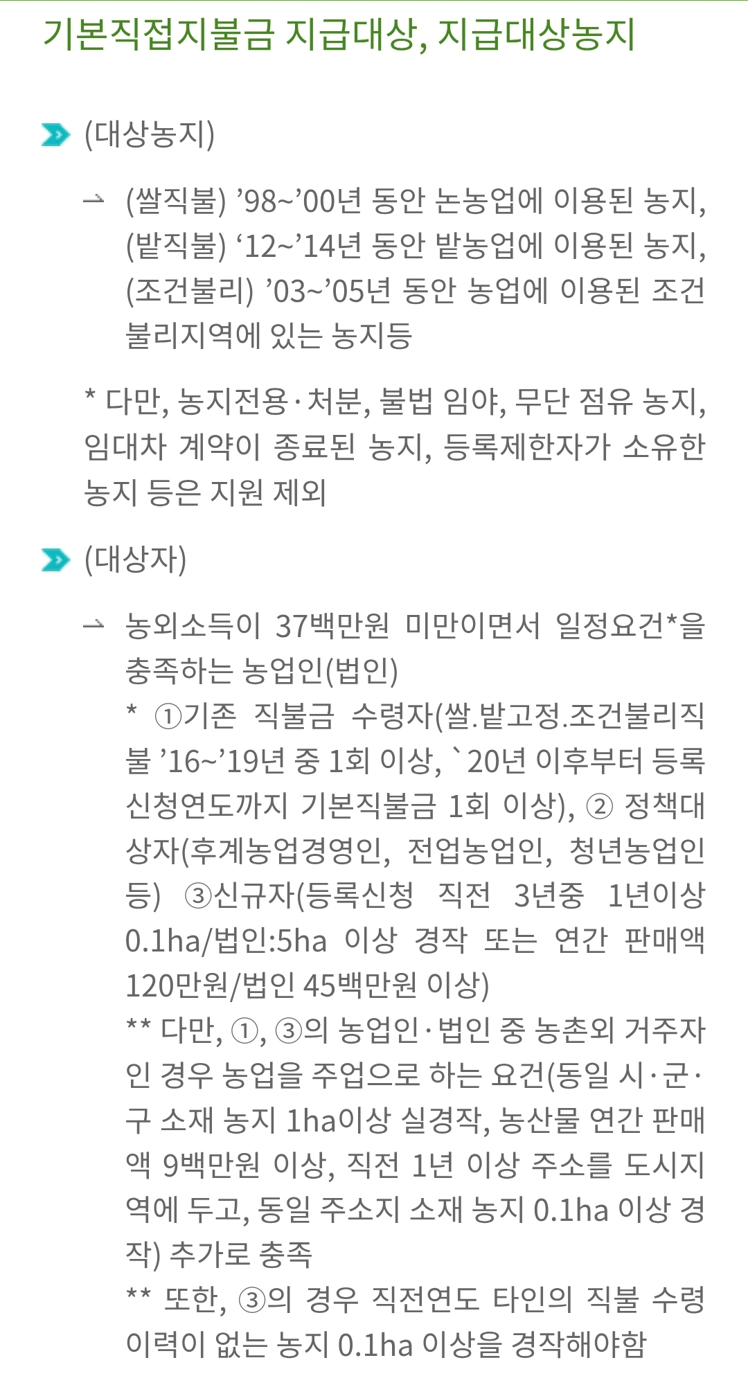 - 농업 외 소득 기준: 농업 외 종합소득 금액이 일정 수준 미만이어야 합니다. (소농직불금의 경우 더 엄격한 기준 적용)