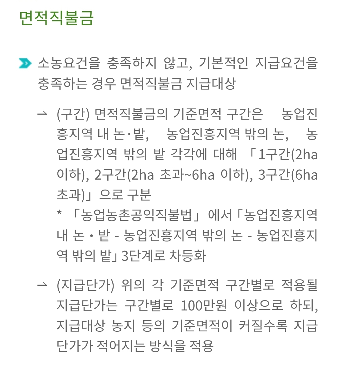 - 면적직불금: 경작 면적에 따라 차등 지급되는 방식으로, 논·밭, 밭, 조건불리 지역 등 농지의 특성과 면적에 따라 지급 단가가 다르게 적용됩니다. 이는 농업 생산 활동에 대한 기본적인 지원을 제공합니다.