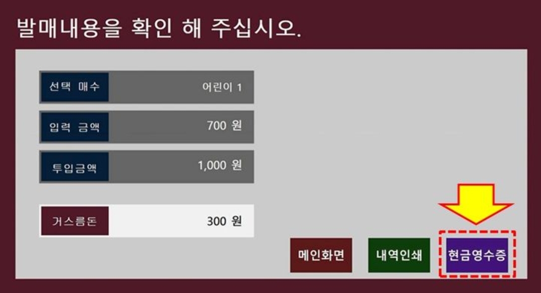 1. 1회용 승차권 자동발매기에서 승차권 구매 시, ‘현금영수증 발급’ 버튼을 누릅니다.