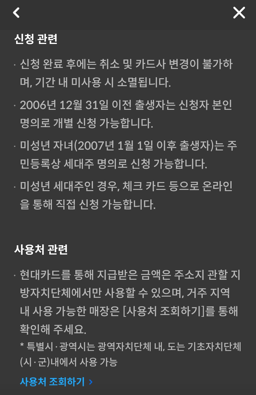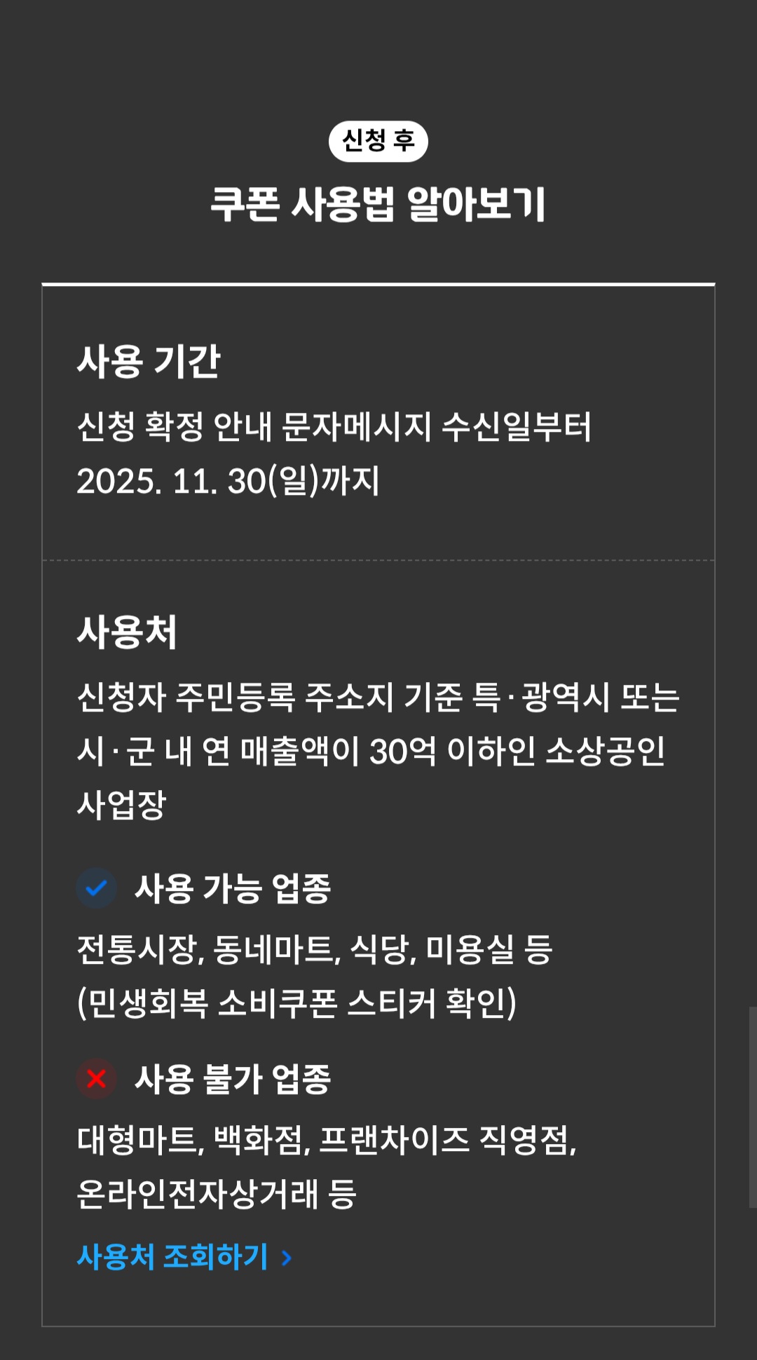 - 사용 불가 업종: 대형마트, 백화점, 프랜차이즈 직영점, 온라인 전자상거래 등