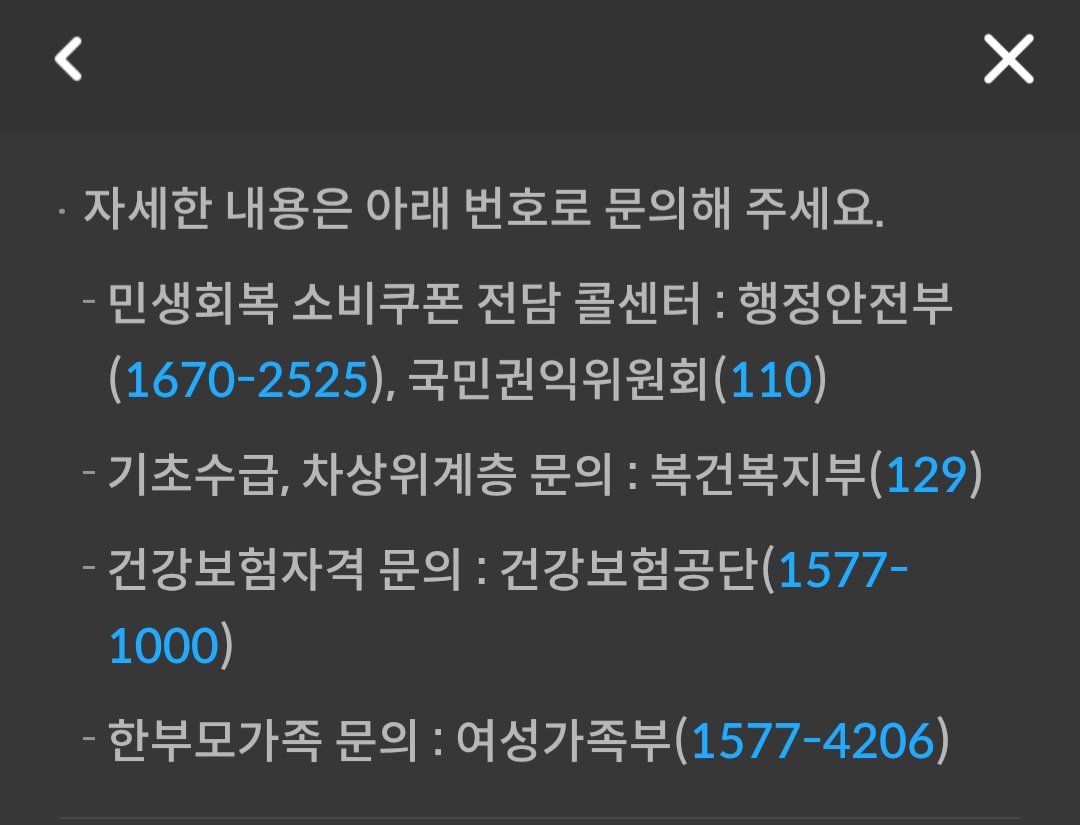 - 민생회복 소비쿠폰 전담 콜센터: 행정안전부(1670-2525), 국민권익위원회(110)