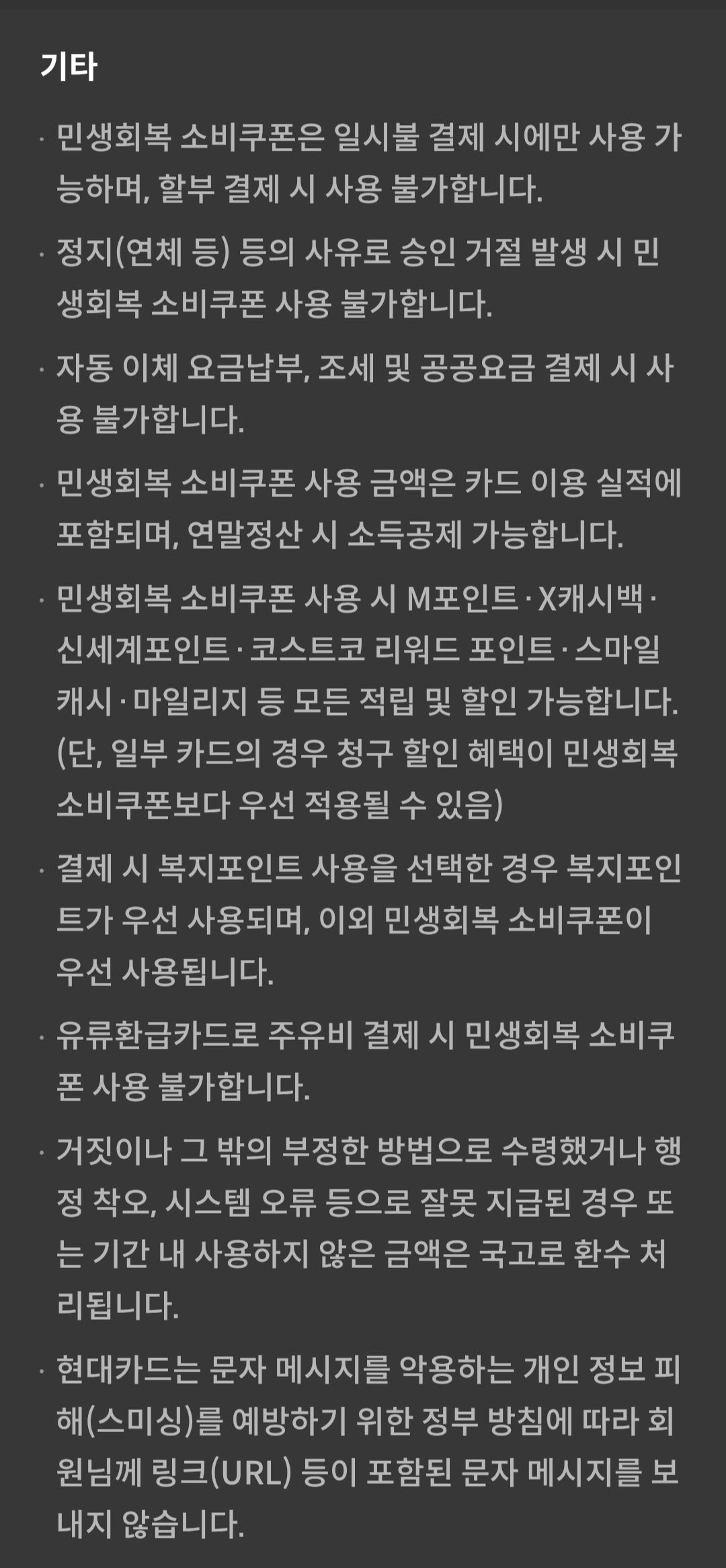 - 복지포인트를 보유한 경우 복지포인트가 우선 사용되며, 그 외에는 민생회복 소비쿠폰이 우선 사용됩니다.