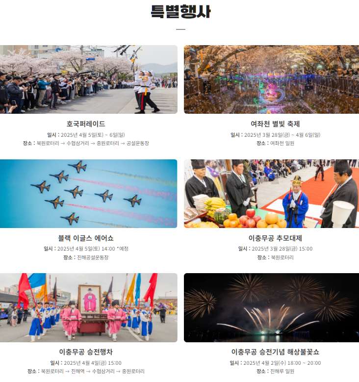 - 주요 행사: 개막 행사, 이충무공 추모대제, 승전행차, 군악의장 페스티벌, 벚꽃 명소 테마 행사 등